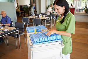 Medikamente, die nicht von den Ärzten abgegeben werden, bestellen wir in einer Apotheke, mit welcher wir kontinuierlich zusammenarbeiten. Diese führt für alle Bewohnerinnen und Bewohner ein Dossier, holt beim Vertrauensarzt ein Dauerrezept ein und rechnet direkt mit der Krankenkasse ab.
